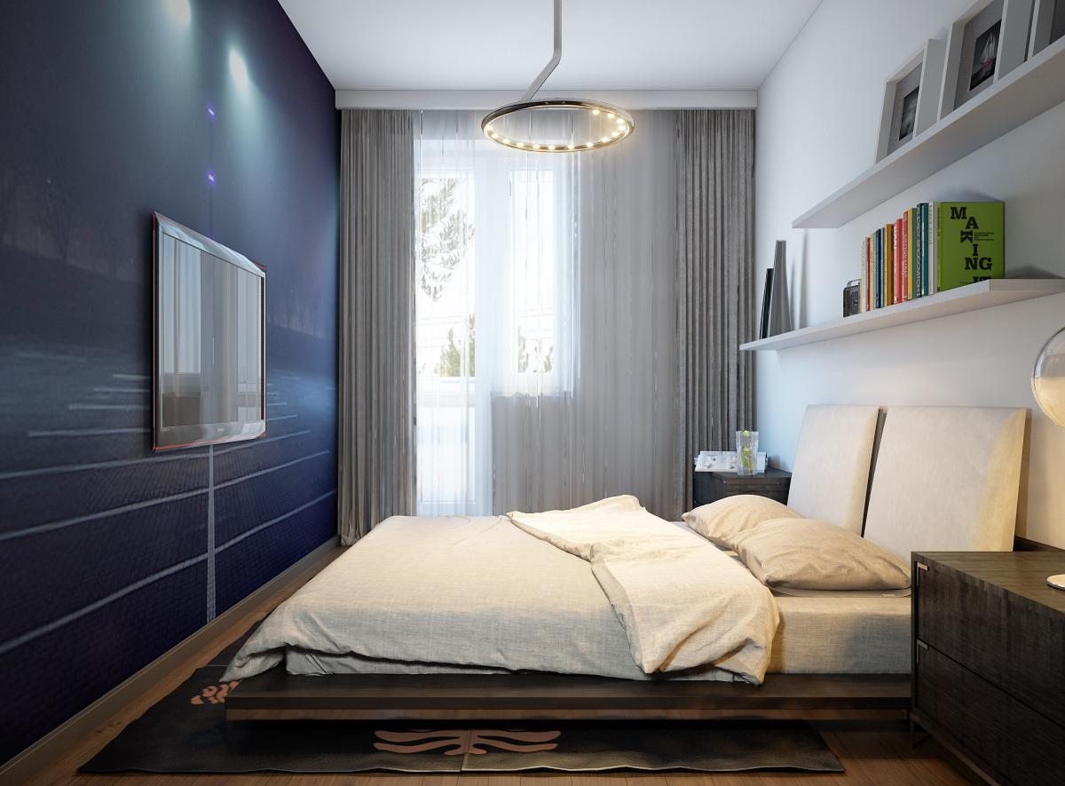Очень важно наполнить комнату функциональной мебелью: кроватью с выдвижными ящиками или подъёмным каркасом, навесными шкафами с хорошей выдвижной фурнитурой. Современные стили предполагают использование прямых линий, обилия света и качественных современных материалов