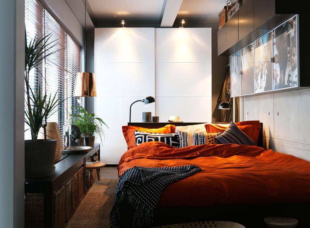 Лучше всего установить в такой спальне встраиваемый шкаф, или шкаф купе с зеркальной дверкой. Они не занимают много места и позволяют компактно разложить все необходимые вещи.