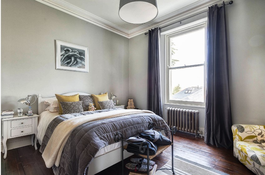 А прикроватный коврик такого же цвета дополнит дизайн спальни 12 кв. м.