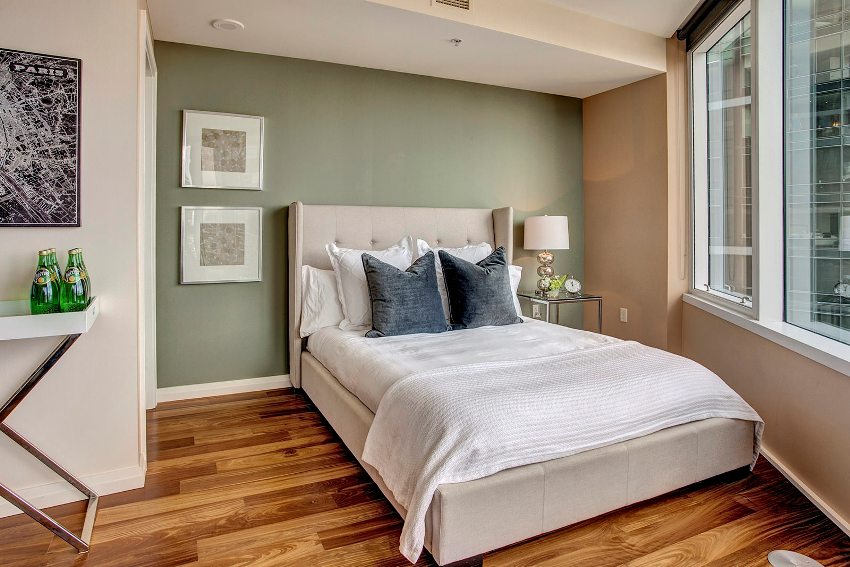В спальне люди часто ходят босиком. По этой причине лучше отдавать предпочтение натуральным покрытиям, например, паркету. Заменить подобные дорогостоящие материалы можно и ламинатом. Если хочется добиться максимального комфорта, можно обустроить систему «теплый пол».