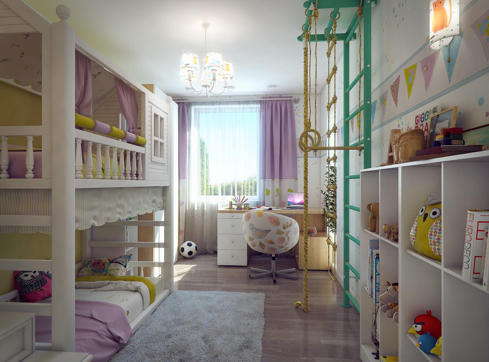 Хорошо будет внедрить игровые моменты — шведскую стенку, канаты, перекладины, лестницы, турники, чтобы дети привыкали к физической активности и считали это чем-то интересным и полезным. Столы для рисования в раннем возрасте со временем придется заменить на полноценные рабочие столы для приготовления домашних заданий.