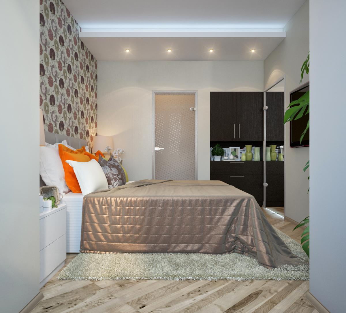 Такая спальня не будет психологически давить на спящего человека своей величиной и в тоже время позволяет создать полноценные и эргономичные функциональные зоны: зону сна, зону хранения вещей, небольшой уголок отдыха, рабочее место, детский уголок.
