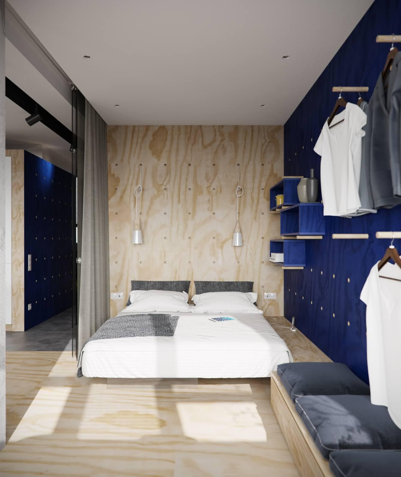 Для небольшой спальни подойдет и оформление в морском стиле. Уникальное сочетание темного и светлого цвета, а именно синего и белого позволяет не просто сделать запоминающийся интерьер, но и совместить контрасты и правильно расставить акценты.