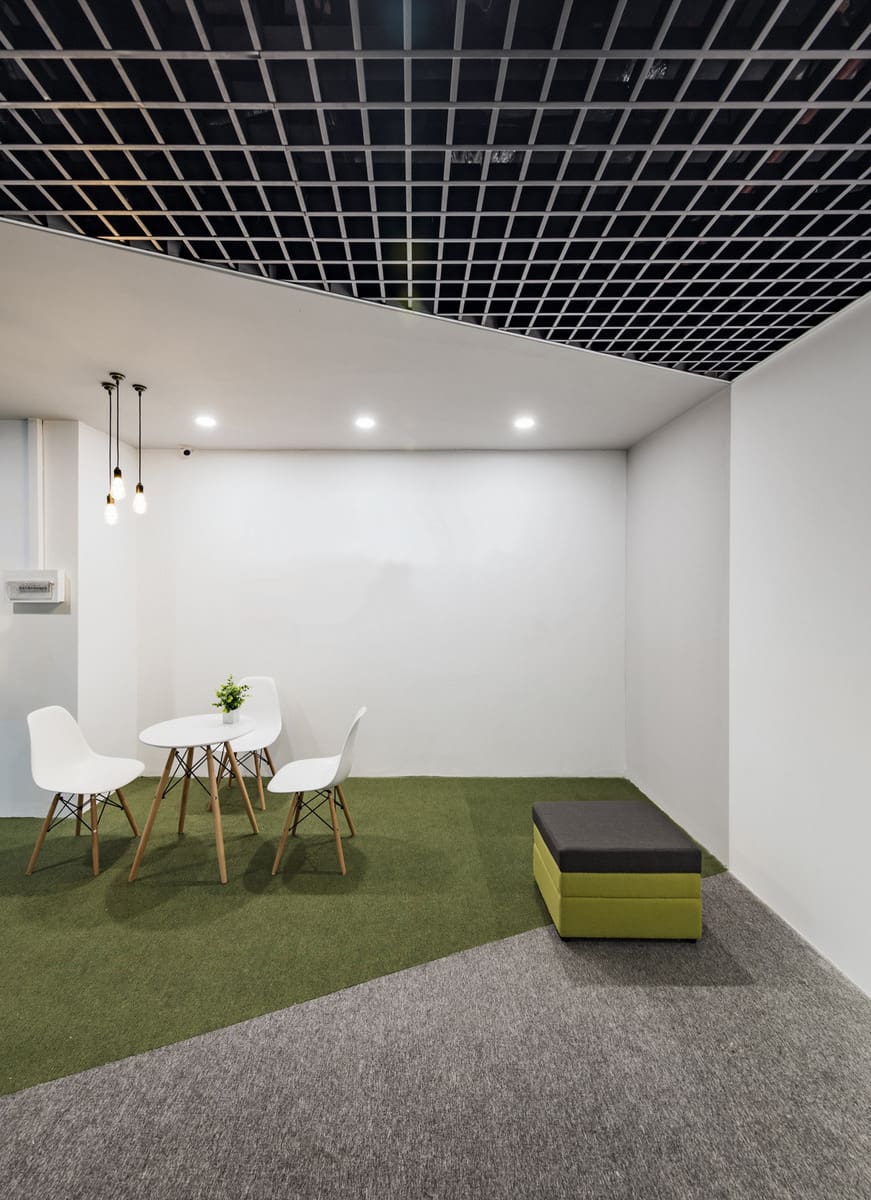 Главная фишка — яркий потолок при светлых стенах. Самым трендовым считается сочетание зеленого с белым.