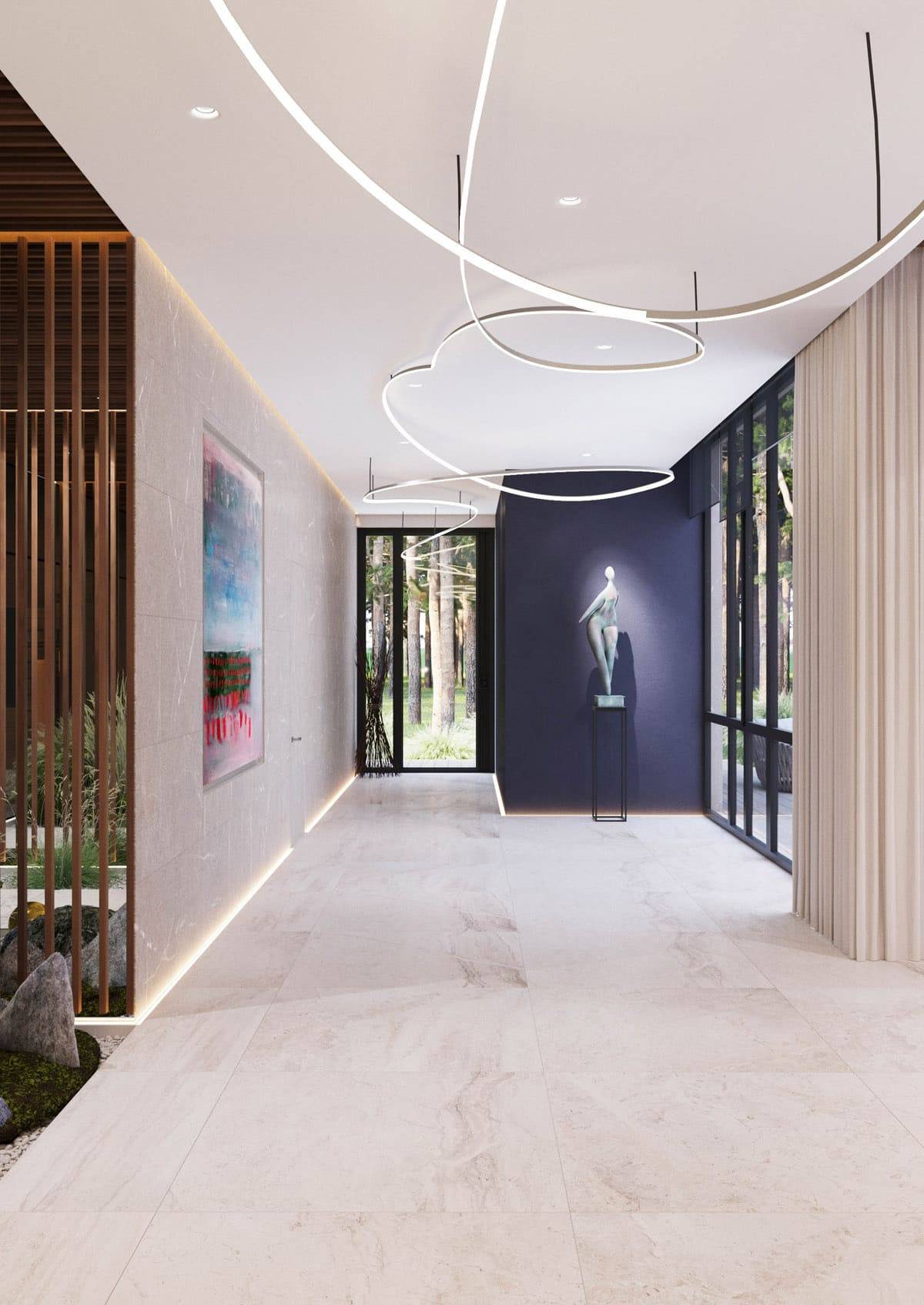 Такой декор можно нанести на гипсокартонные конструкции и подчеркнуть контрастный переход цвета встроенной подсветкой. Полосы с потолка могут плавно «спускаться» на одну из стен.