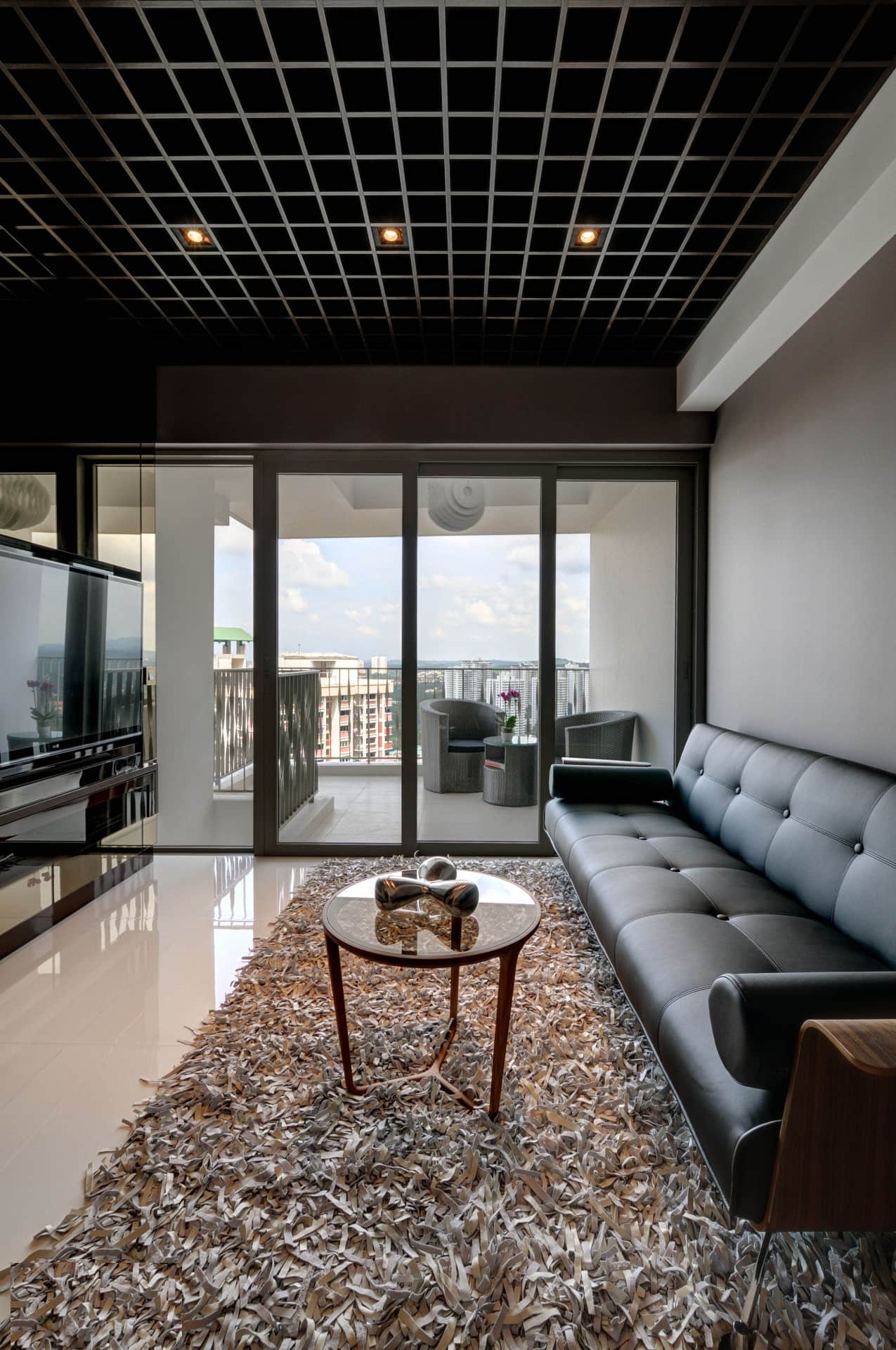 Натяжной потолок послужит отличным фоном для такой комнаты, он не будет отвлекать внимание от арт-объектов, так как именно такая поверхность обладает свойством четкой цветопередачи