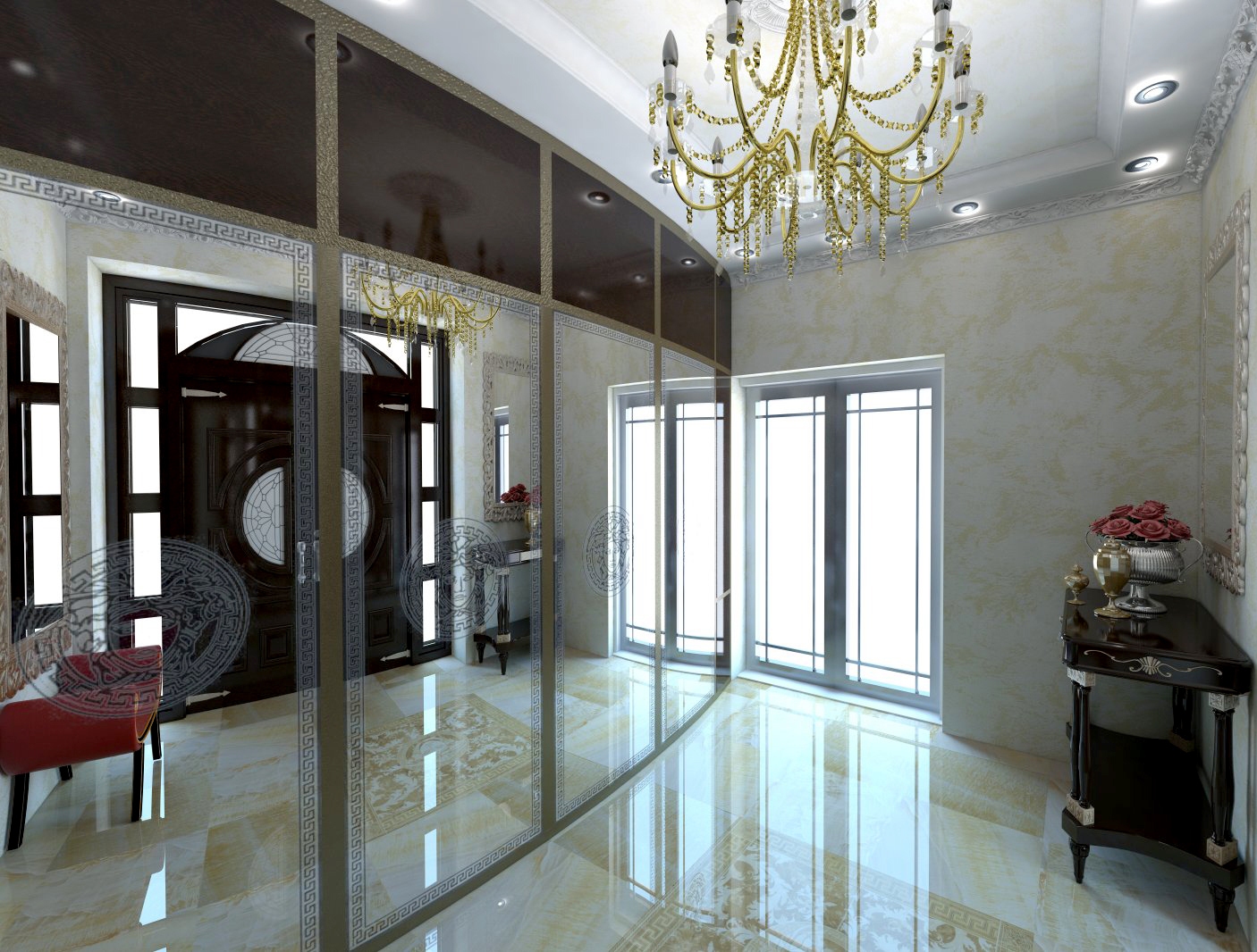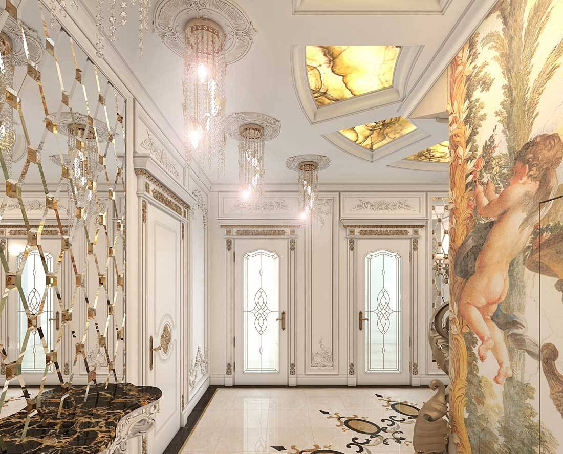 На фото большая прихожая в частном доме в классическом стиле, декорированная потолочным точечным освещением и центральной люстрой.