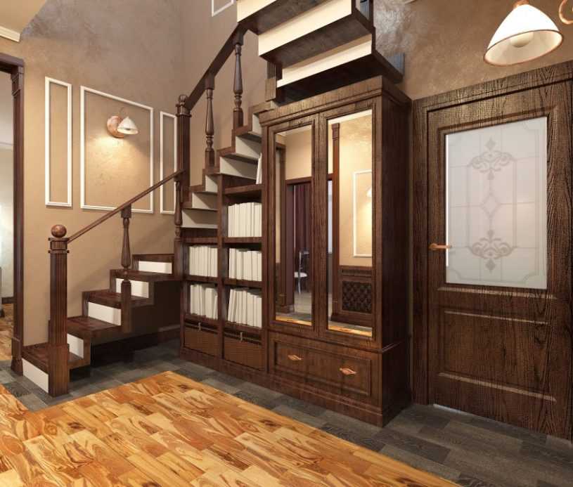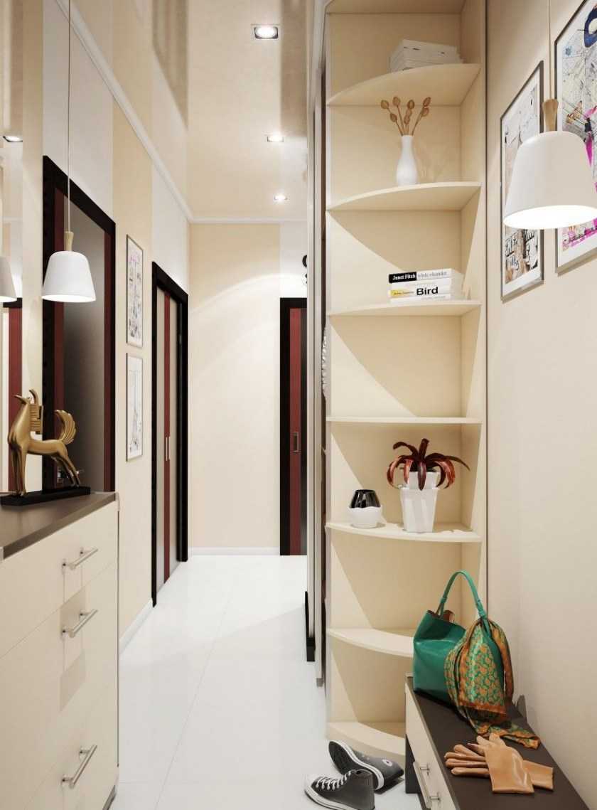 Кроме правильных форм коридора, нередко можно встретить прихожую с нестандартными очертаниями. Такие формы иногда встречаются в частном доме с несколькими этажами, если в прихожей располагается лестница на второй этаж. В такой ситуации при острой нехватке места можно обойтись минимальным набором мебели – зеркалом и скамейкой возле входной двери, а одежду размещать на вешалке под лестницей. Иногда помещение необычной формы является задумкой при планировании квартиры, что тоже не является большой проблемой. В такой ситуации будет целесообразно заказать мебель по индивидуальным размерам, что позволит максимально компактно расположить ее на небольшой площади коридора.
