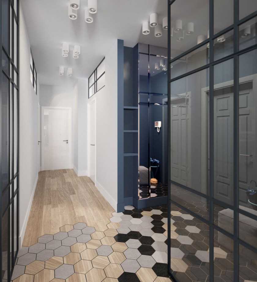 Также хорошее решение — скомбинировать на полу два материала: например, во входной зоне положить стильную плитку с узором, а в коридоре паркетную доску