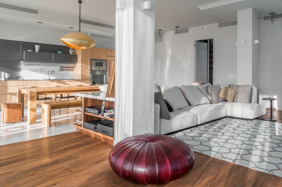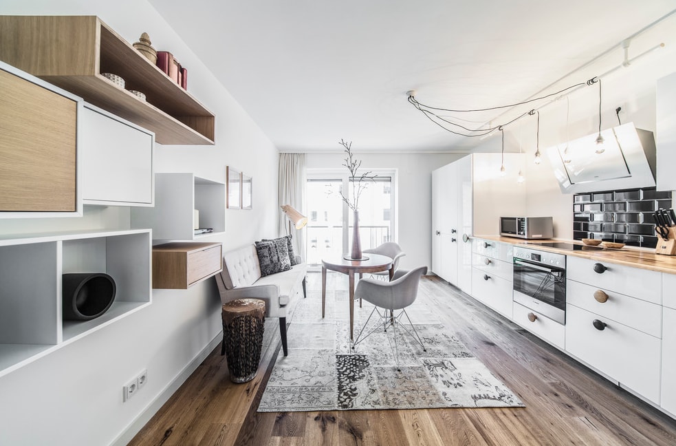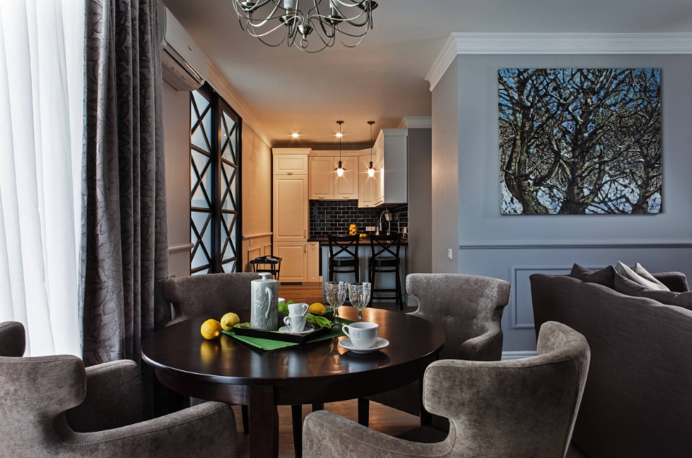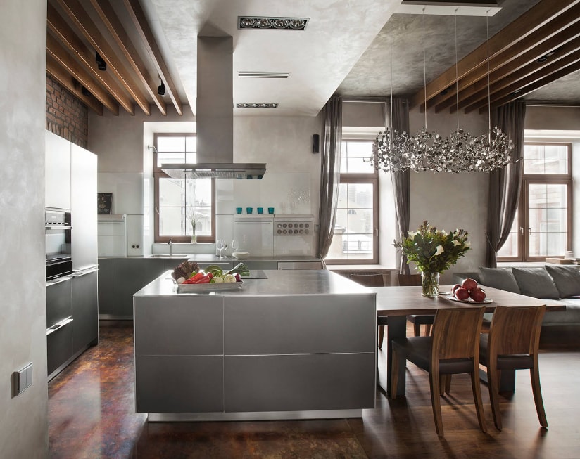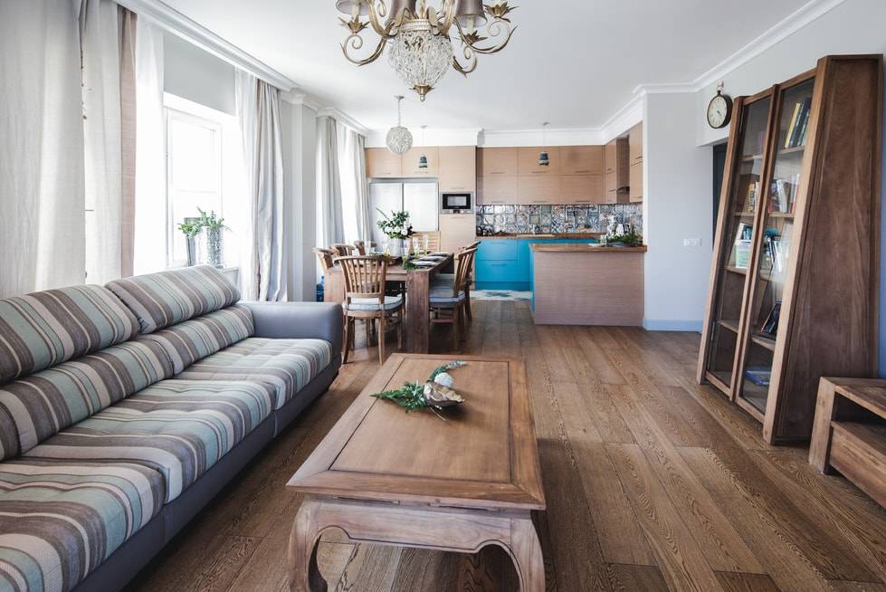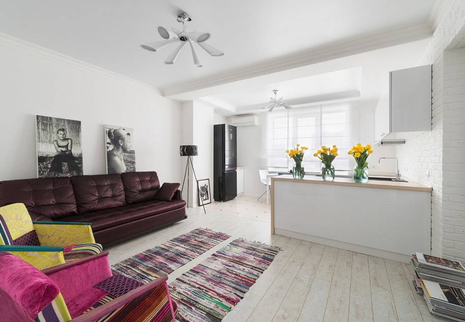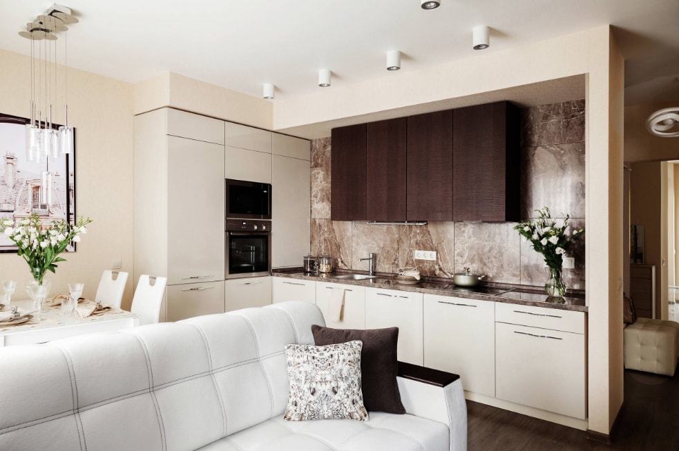 Если все в порядке, то можно приступать к перепланировке. Совсем необязательно оформлять будущее пространство в едином стиле. Будет намного лучше, если комната будет поделена на несколько зон: кухонную и гостевую. Идеально, если одна зона будет плавно переходить в другую.