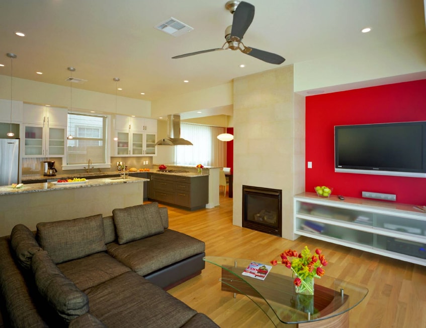 Если кухня-гостиная находится в частном доме или имеет большую площадь, электрический камин будет гармонично вписываться в интерьер.