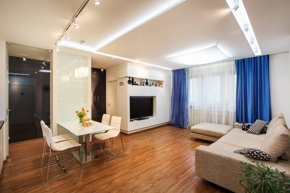 Для зонирования используют потолочные покрытия. Создают выступы из гипсокартона или натяжных полотен, которые служат визуальной границей. Также используют световые линии, многоуровневое освещение.