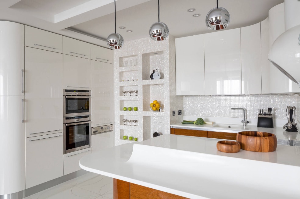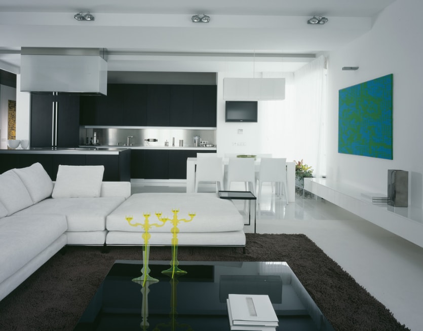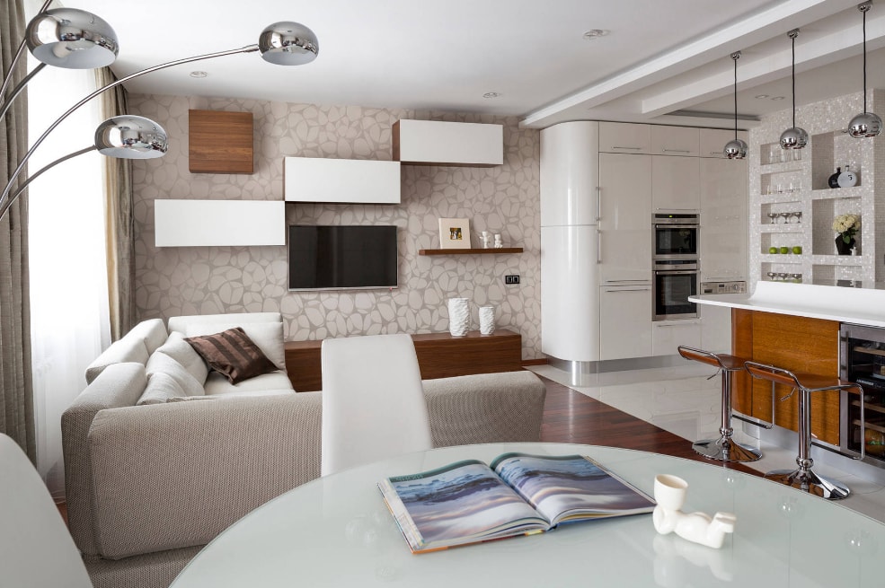 Неброская и светлая гамма зрительно увеличивает помещение. Используют дымчатую, кремовую, бежевую и другую нежную пастельную палитру. Стильная кухня-гостиная в белом цвете всегда смотрится свежо и воздушно. Благодаря разнообразным вариациям белоснежных оттенков можно сделать дизайн более интересным.