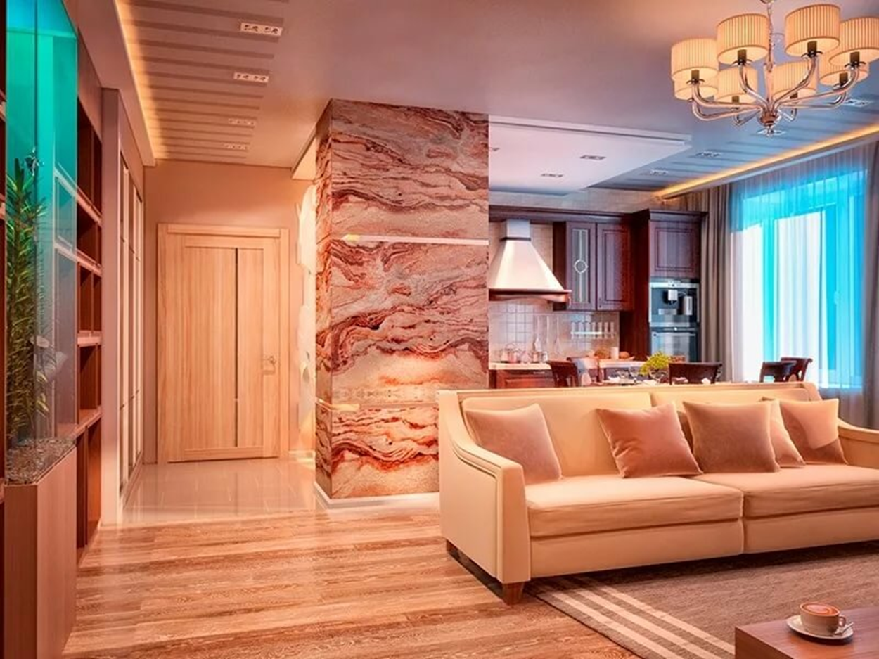 Для кухонной зоны рекомендуется использовать легко моющиеся, термоустойчивые покрытия, которые не впитывают запахи. Применяют плитку, акрил, керамогранит, влагоустойчивую краску. Гостиную оформляют натуральными материалами, используют дерево, ламинат, ковровые покрытия. Между собой материалы могут перекликаться по цвету, дополнять друг друга. Фактуры материалов будут различаться, автоматически образовывать границу.