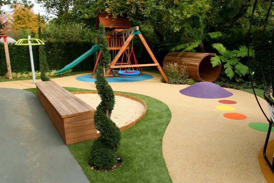 Детская площадка в ландшафтном дизайнеВ хорошо продуманном плане ландшафтного дизайна дачного участка, постройки: хозяйственный блок, баня, беседка, мангал, бассейн, гараж, детская площадка; не теснятся друг с другом, не выглядят необдуманными или «случайными», а поддерживают стилистику самого дома, подчеркивают все достоинства главного строения.