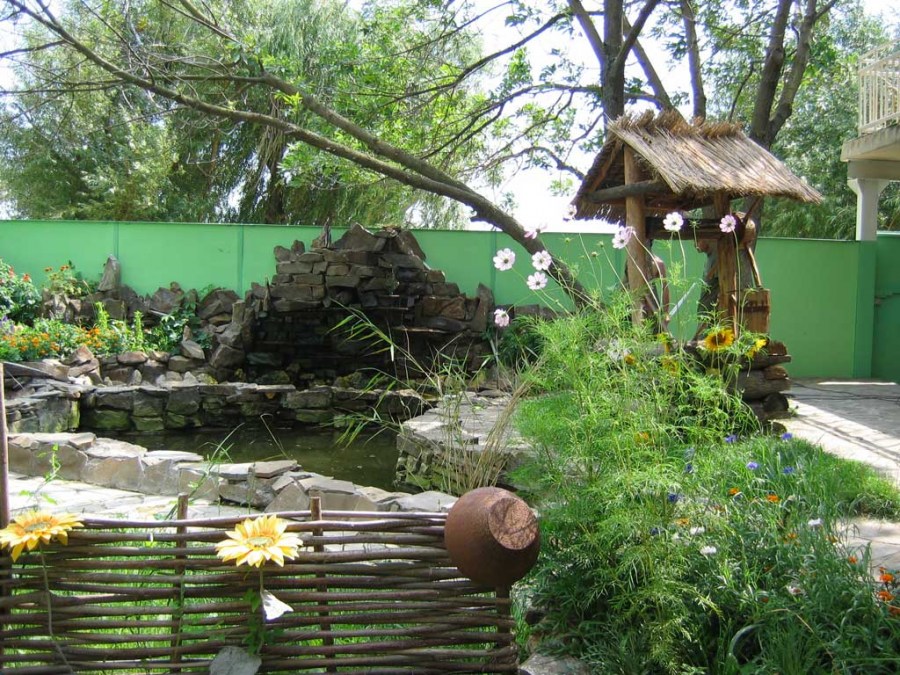 - Большой пруд на маленьком участке выглядит нелепо, а вот искусственный компактный водопад с ручьем или сухие ручейки смотрятся намного красивее. Малоформатный колодец станет привлекательным акцентом, вокруг которого расставляют садовую мебель, сооружают зону отдыха. Колодец делают натуральным или декоративным из камня, старой бочки и пр.