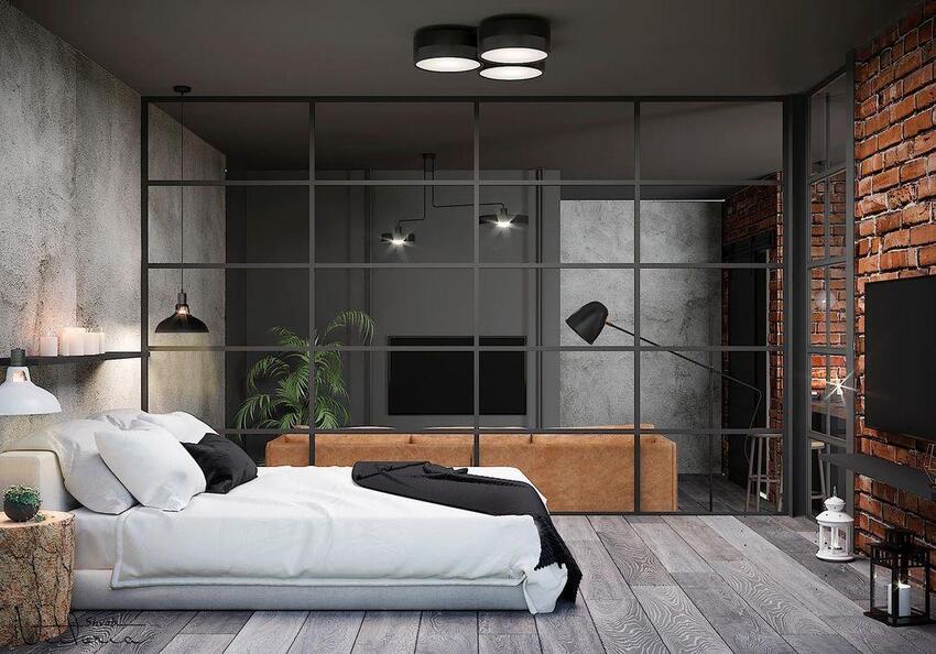 Интерьер спальни в стиле лофт узнаваем по бетонным или кирпичным стенам, открытых коммуникациях, металлических светильниках и мебели, сделанной своими руками из подручных материалов.
