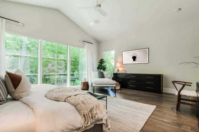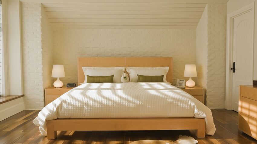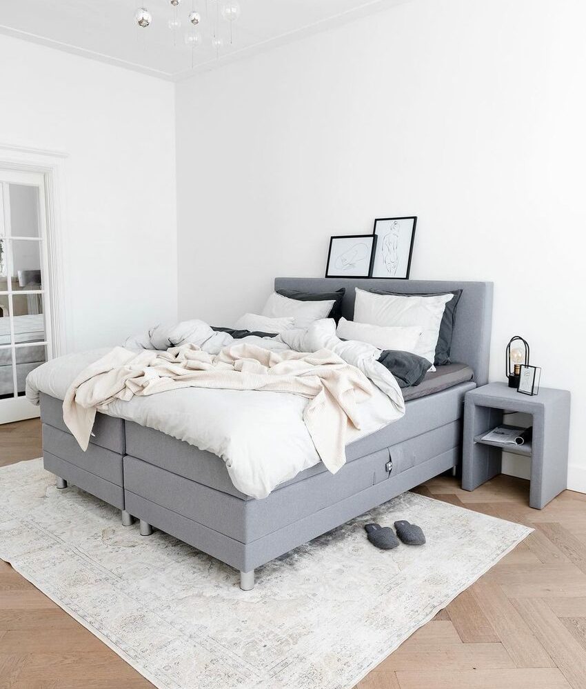 Отдавайте предпочтение однотонной отделке и мебели: спокойная нейтральная палитра цветов – идеальное решение для спальни в современном стиле.