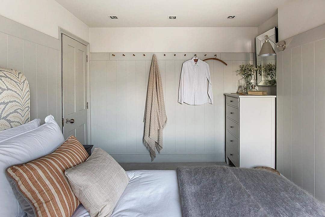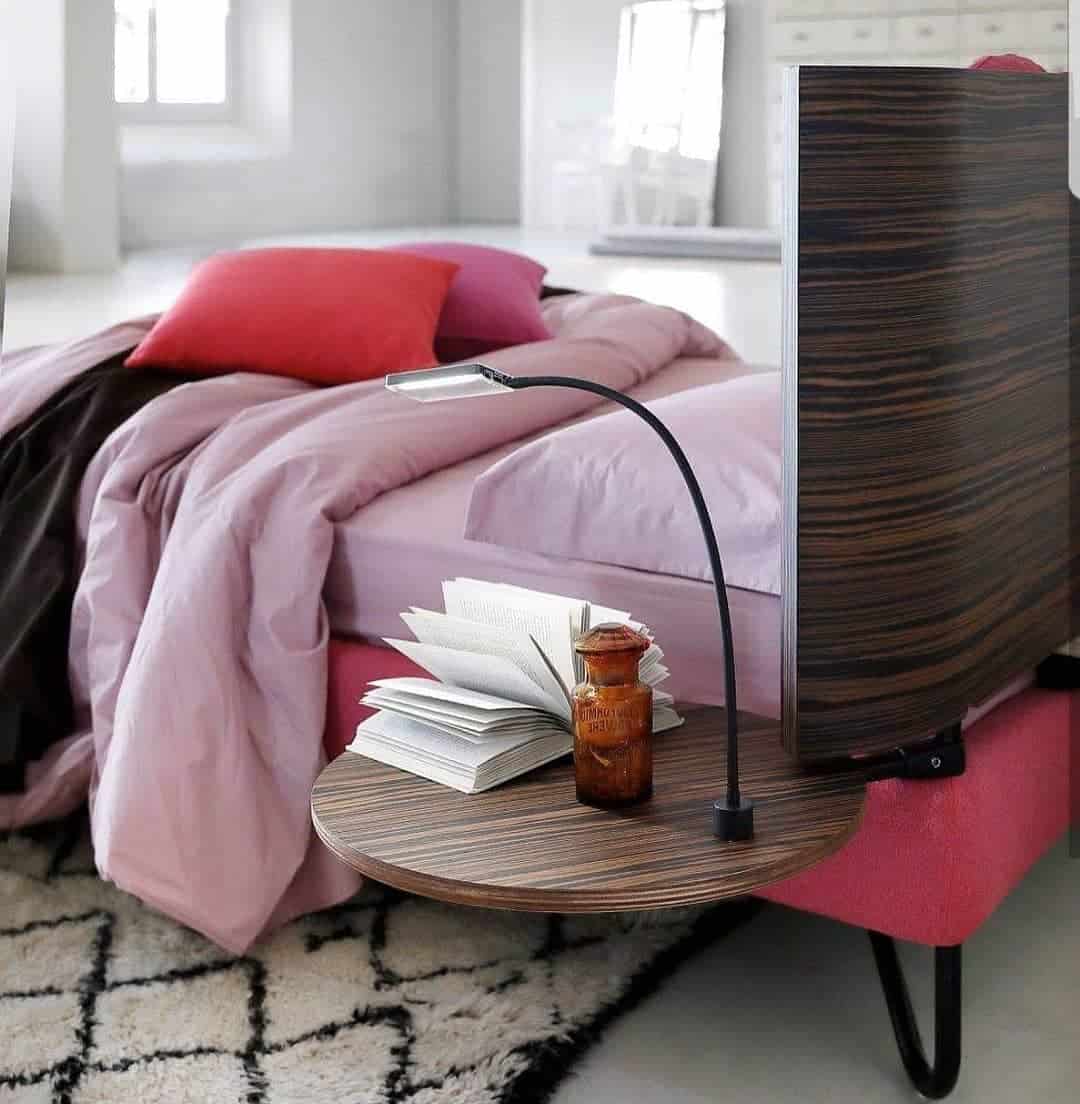 - Мебель для спальни должна иметь компактные размеры, но в то же время, иметь достаточно вместительные зоны хранения. Например, организованная в стенной нише гардеробная или небольшой подвесной комод существенно увеличивают доступную площадь для белья, полотенец, личных вещей, предметов гигиены, канцелярских принадлежностей.