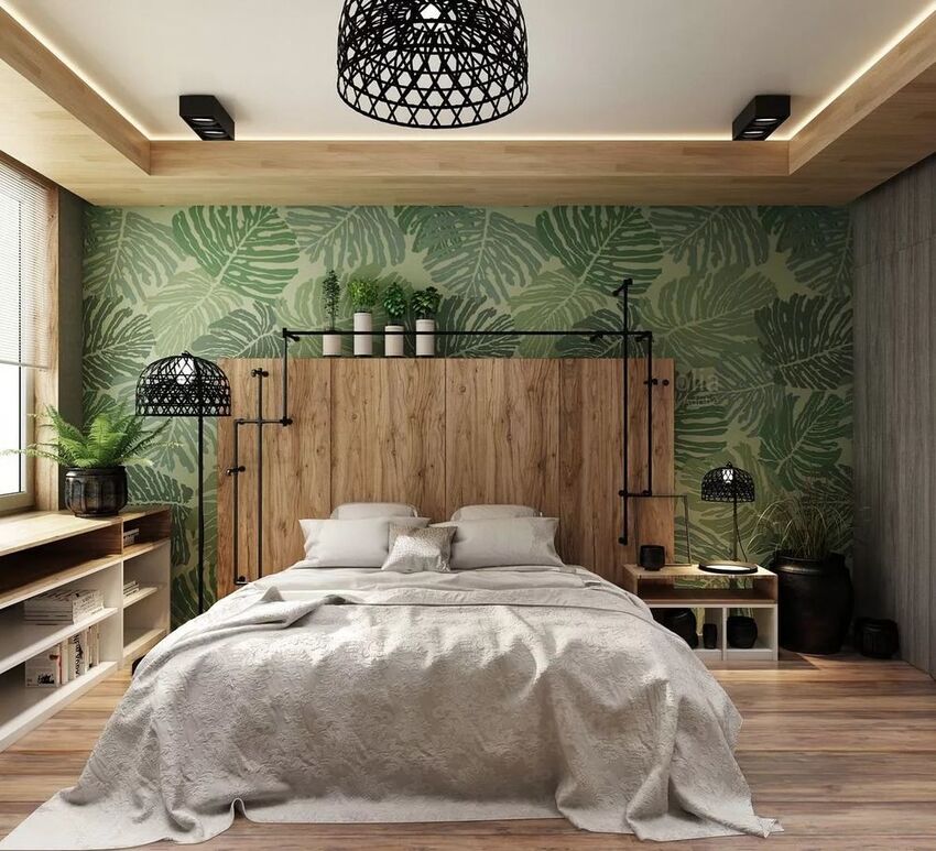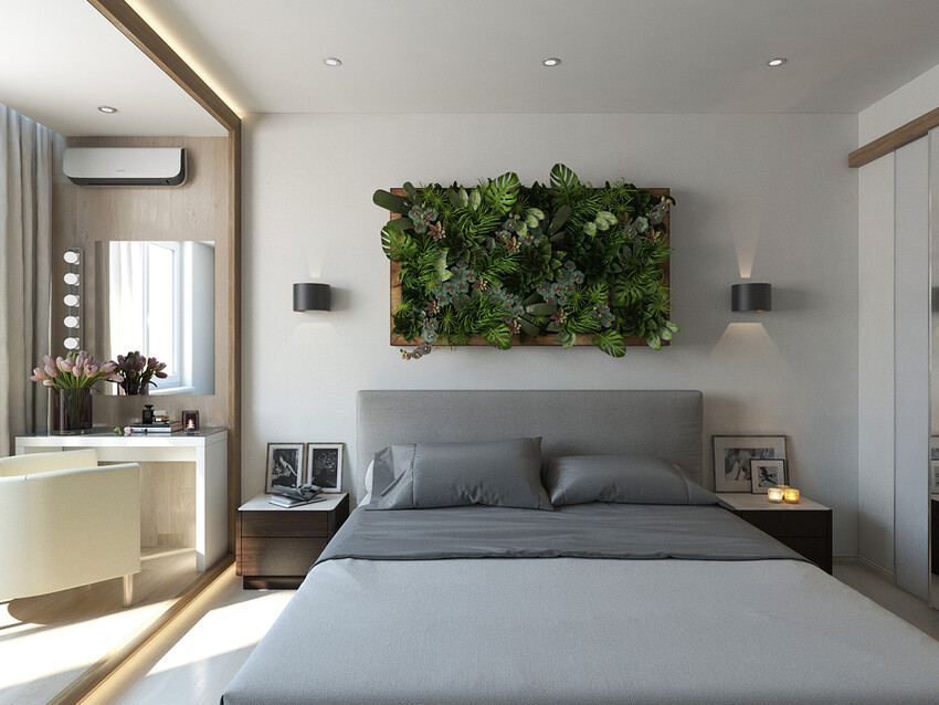 В такой спальне много зеленой растительности и живых цветов.