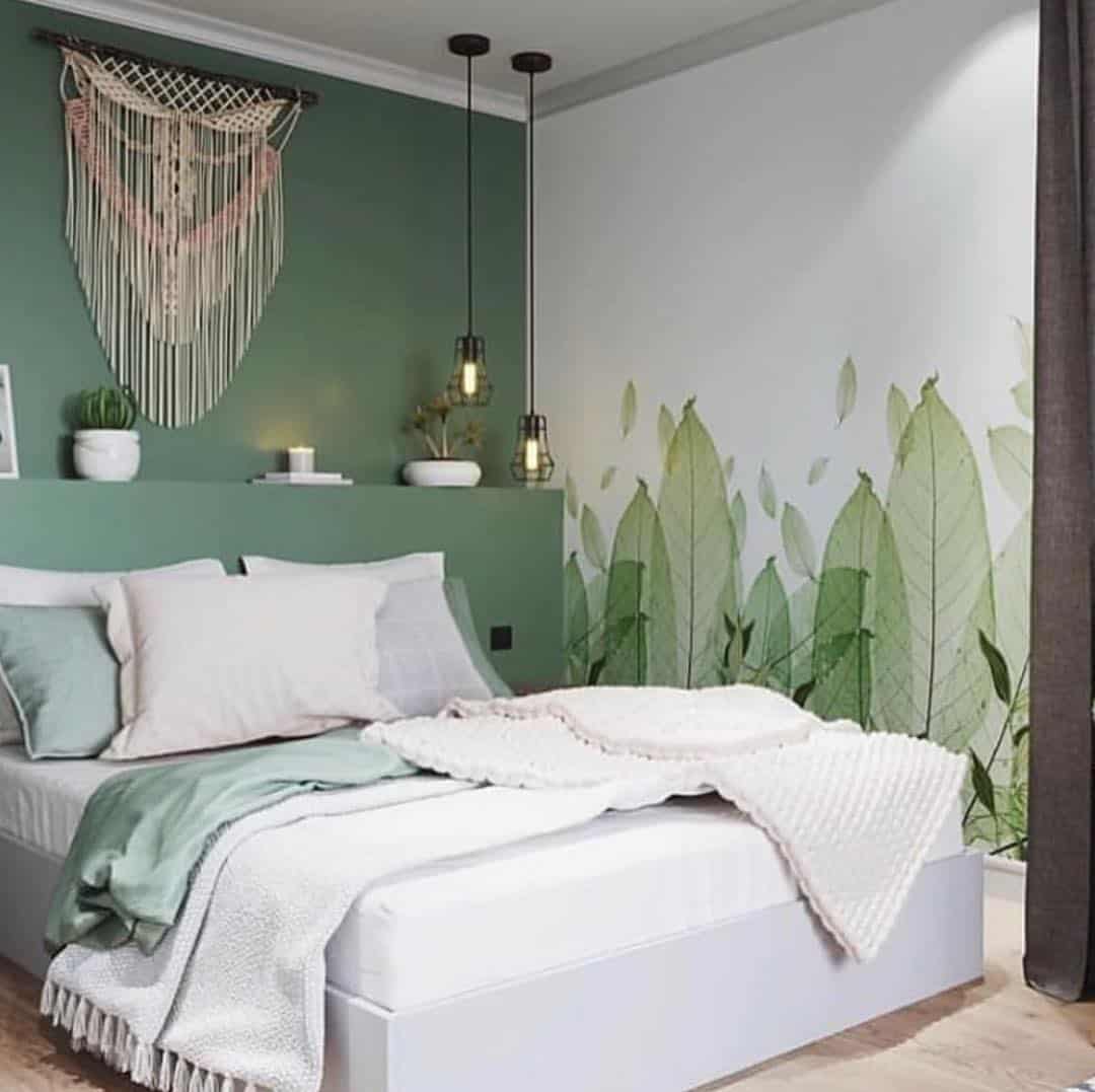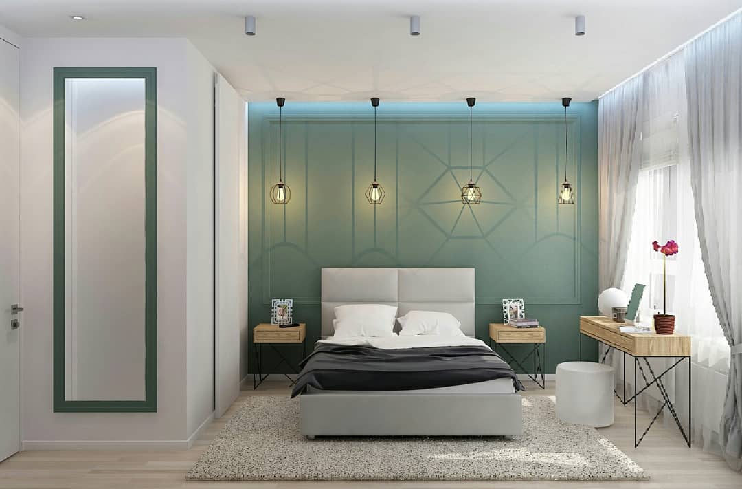 При оформлении спальни популярным вариантом считается использование оттенков базовых цветов. Так, например, часто хозяева отдают предпочтение таким зеленым тонам как фисташковый, мятный, оливковый и пр.