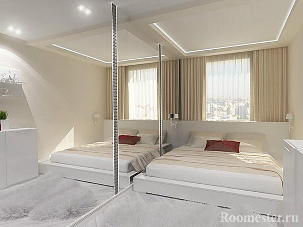 Плотные белые шторы прекрасно справляются с зонированием спальни-гостиной