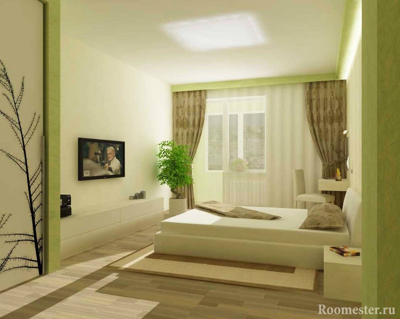 Удобнее всего разместить спальное ложе у окна в конце комнаты