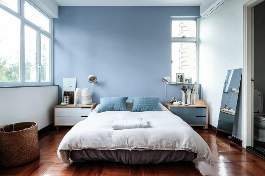 Синий цвет и его оттенки традиционно считаются наиболее подходящими для спальной комнаты. Он служит хорошим фоном для дополнительных ярких цветовых элементов