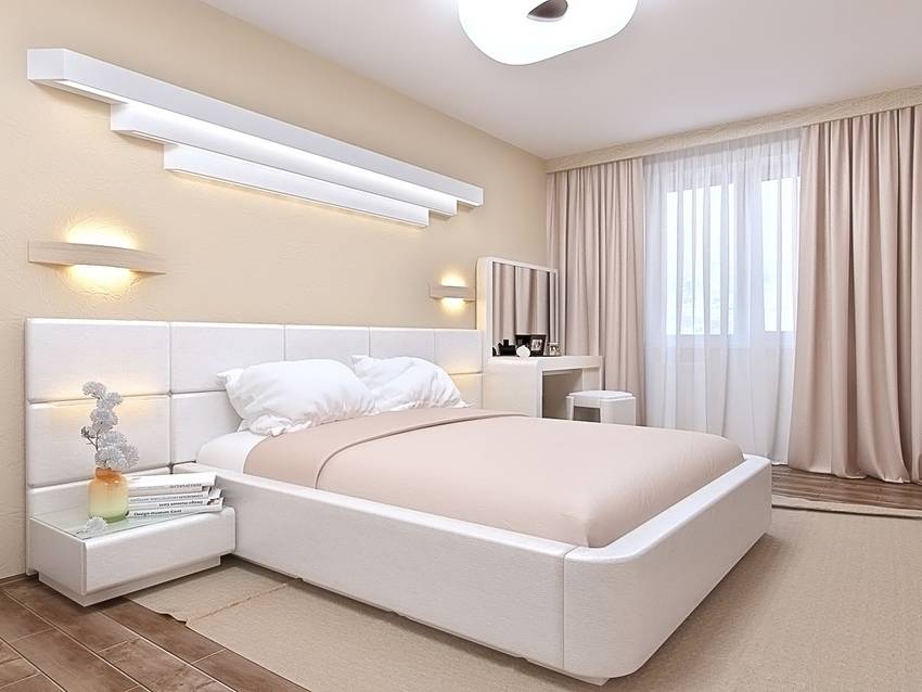 Для спальни подберите теплый вариант. При желании можно дополнительно приобрести настенные или прикроватные светильники, которые создадут приглушенный свет.