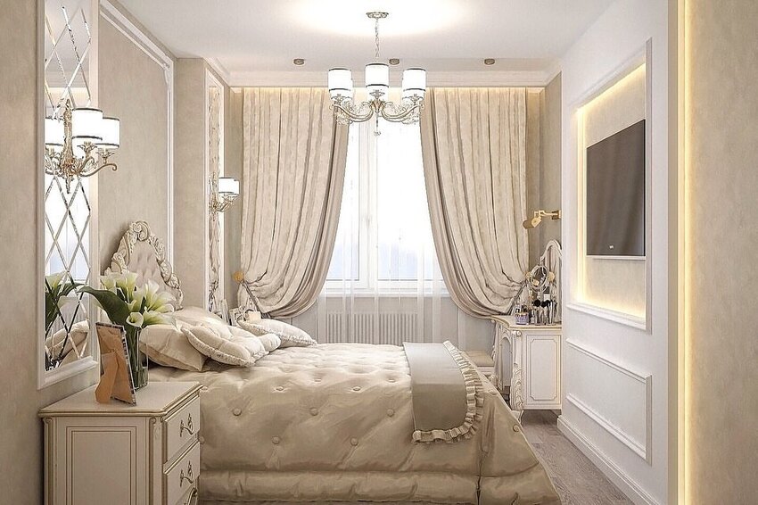 Обязательно в маленькой спальне наличие хотя бы одного зеркала. Если разместить зеркало напротив окна, то поступающий с улицы свет будет в нем отражаться и это поспособствует зрительному увеличению помещения. Такой дизайн изображен на фото. Но в непосредственной близости от кровати зеркал быть не должно.