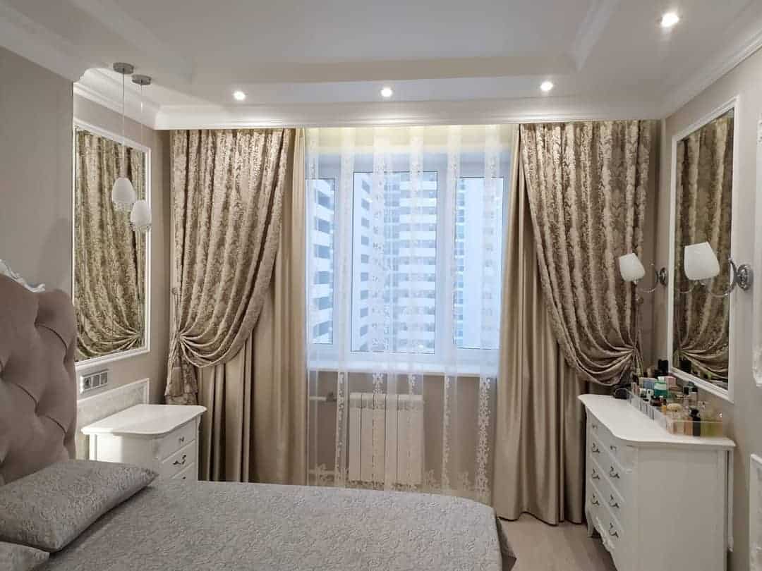 Шторы являются немаловажным элементом декора, поэтому тоже требуют тщательного подбора. В спальне с широким окном рекомендуется приобрести широкую штору, от стены до стены. Желательно, чтобы они свободно свисали или были слегка собраны.