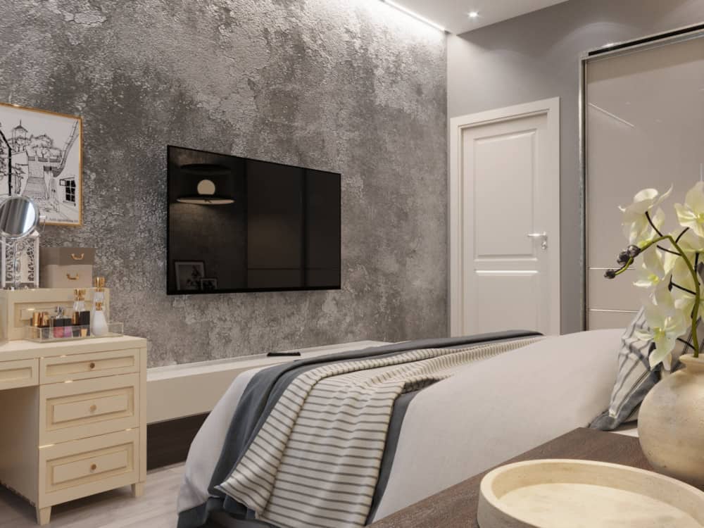 В современных спальнях редко увидишь много мебели, так что если без шкафа не обойтись – выбирай высокие шкафы-купе в потолок, которые визуально почти сливаются со стеной. Под телевизор встанет длинная низкая тумба-столешница с разными секциями и ящиками. Очень популярна подвесная мебель без ножек, а вот декоративные резные комоды лучше оставить для классики.