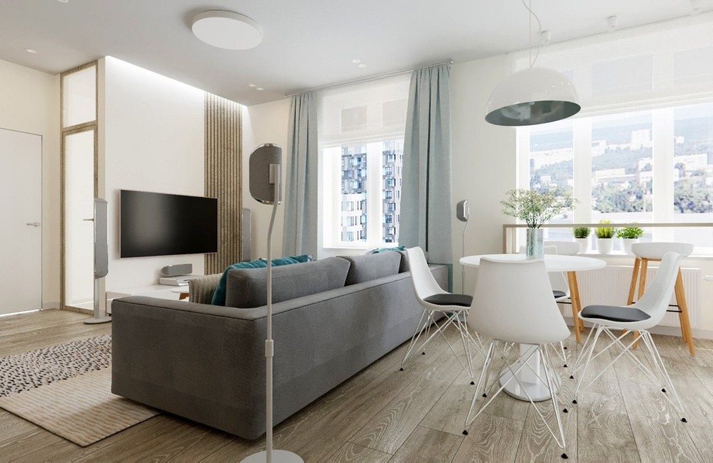 Используйте шторы спокойных тонов – это лучший вариант, который не испортит гостиную в серых тонах. Можно отдать предпочтение двухцветным шторам в современном стиле. Например, белый с бирюзовым или фиолетовый с салатовым.