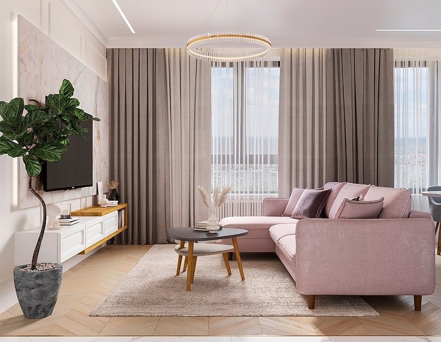 Гостиная в розовых и мятных сочетаниях. Оригинальный и свежий дизайн совершенно не вызывает дискомфорта. Наоборот, такое сочетание радует глаз и создает праздничную атмосферу