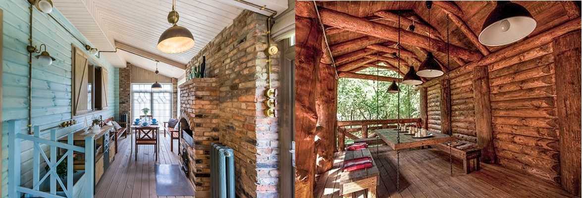 Всегда в любое время в моде винтаж: элементы разных стилей, нарочитая небрежность, за которой скрывается тонкий расчет и тщательная обработка. Остромоден в последнее время стиль лофт. Отделка веранды в таком стиле потребует от вас проявления фантазии и необычных техник. Например, кирпичную стену вам нужно будет не штукатурить, выравнивая, а тонировать, выявляя еще больше ее неоднородность и неодинаковость. Таким способом недостатки превращаются в достоинства. Чтобы не ошибиться, и набить руку, потренируйтесь на каком-нибудь другом куске стены, например, в бытовке или сарае. Когда идея точно оформится и то, что у вас получилось, вас устроит, можно применять полученные навыки на основной стене.