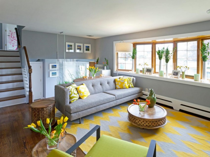 Проще всего зонировать интерьер гостиной в 18 метров с помощью напольного покрытия. Например, место для отдыха выделяется обычным ковром. Это просто и незатратно.