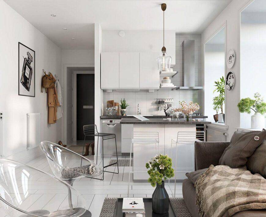 Кухня может быть совмещена с гостиной, но при этом отделяться от нее барной стойкой, которая в то же время может выступать в роли обеденной зоны и «острова».