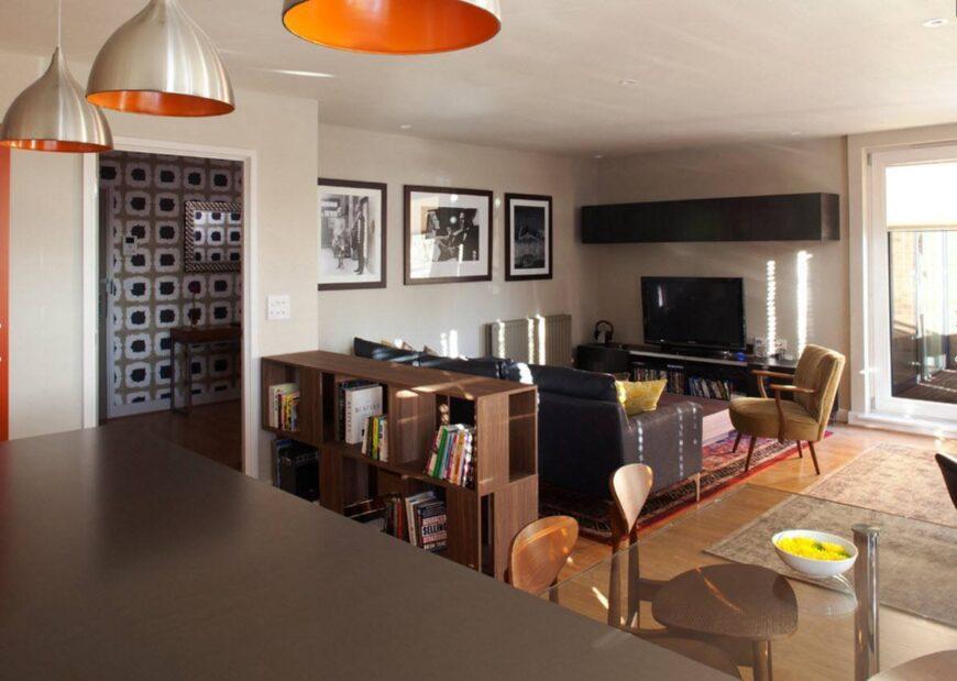 В современном дизайне часто совмещают гостиную с кухней. Для разделения можно использовать простые материалы, например, пластик или гипсокартон, которые стоят недорого.