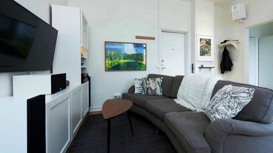 Чтобы разделить интерьер однокомнатной квартиры на функциональные зоны, необязательно использовать стены или гипсокартонные перегородки. Вышеупомянутая мебель-трансформер позволит гостиной одновременно выступать в роли спальни.