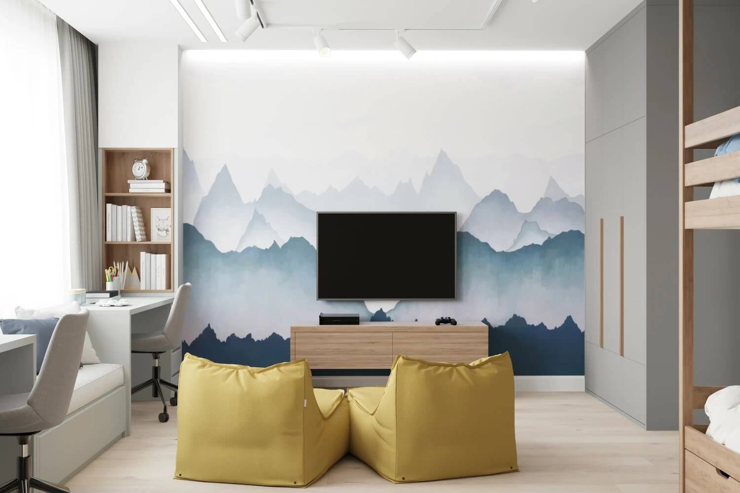 Акварельный пейзаж благодаря подсветке будет выглядеть выразительно и создаст загадочную атмосферу в тёмное время суток. Проект квартиры с детской для двоих мальчиков, дизайн студии Katushhha