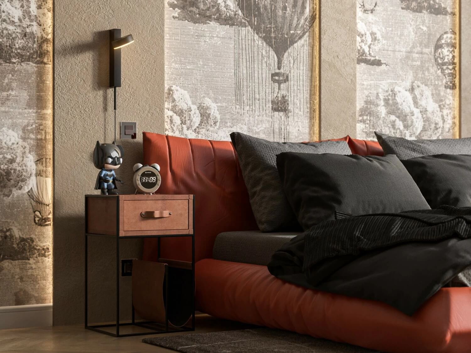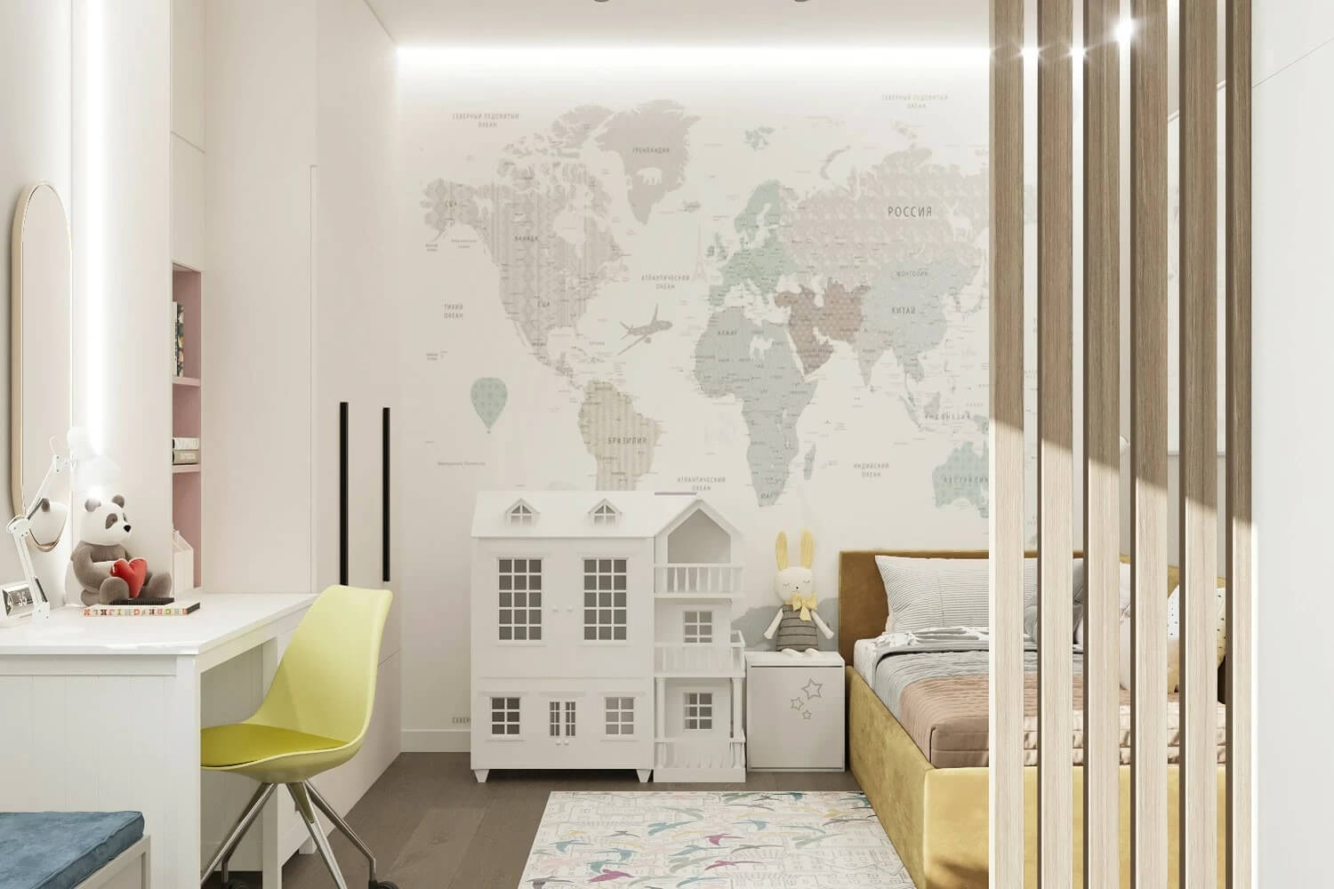 Отличный ночник для маленьких любителей путешествий — фотообои с картой мира. Сны о дальних странах обеспечены. Проект квартиры в ЖК «Галактика Pro», дизайн студии Katushhha