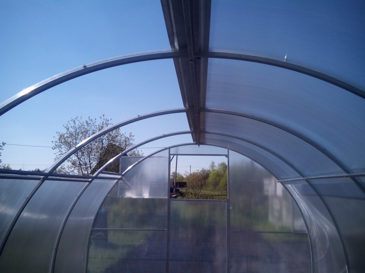 Арочная. Каркас выполняется в виде полукруга, что способствует равномерному распределению влаги внутри конструкции и стеканию конденсата по стенкам теплицы. Для удобства использования такое сооружения делят на сегменты, соединяемые между собой в верхней части.