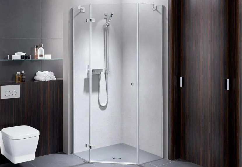 Эту конструкцию образуют металлический каркас, стеклянные стенки и двери. Система может монтироваться в углу ванной комнаты, тогда 2 стороны закрываются стенами помещения, 2 другие — панелями из стекла.