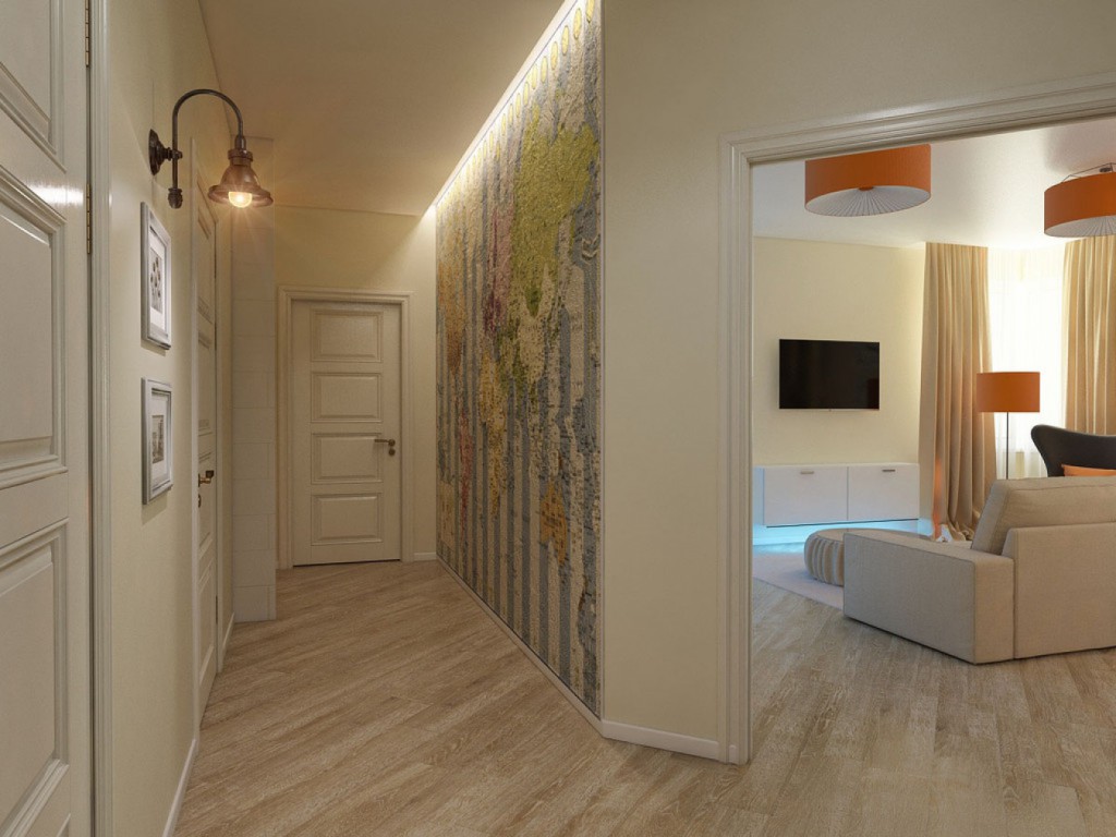 - Прихожая с четко отделенным коридором. Такой холл получается, когда в прихожую выходят двери ванны, туалета и кухни, далее идет коридор, а уже в него выходят двери жилых комнат.
