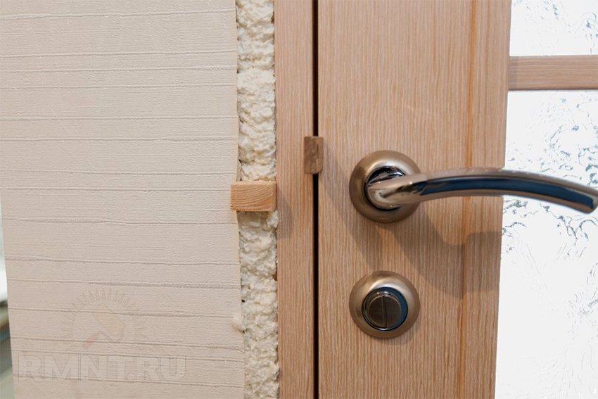 - заполнить монтажной пеной пустоты между дверной коробкой и проемом, срезать излишки после высыхания (через сутки) под углом (от коробки в сторону основания).