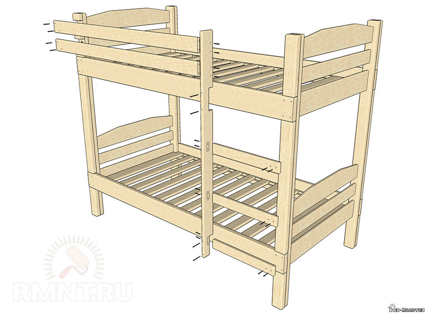Сборка двухъярусной кровати своими руками осуществляется следующим образом: