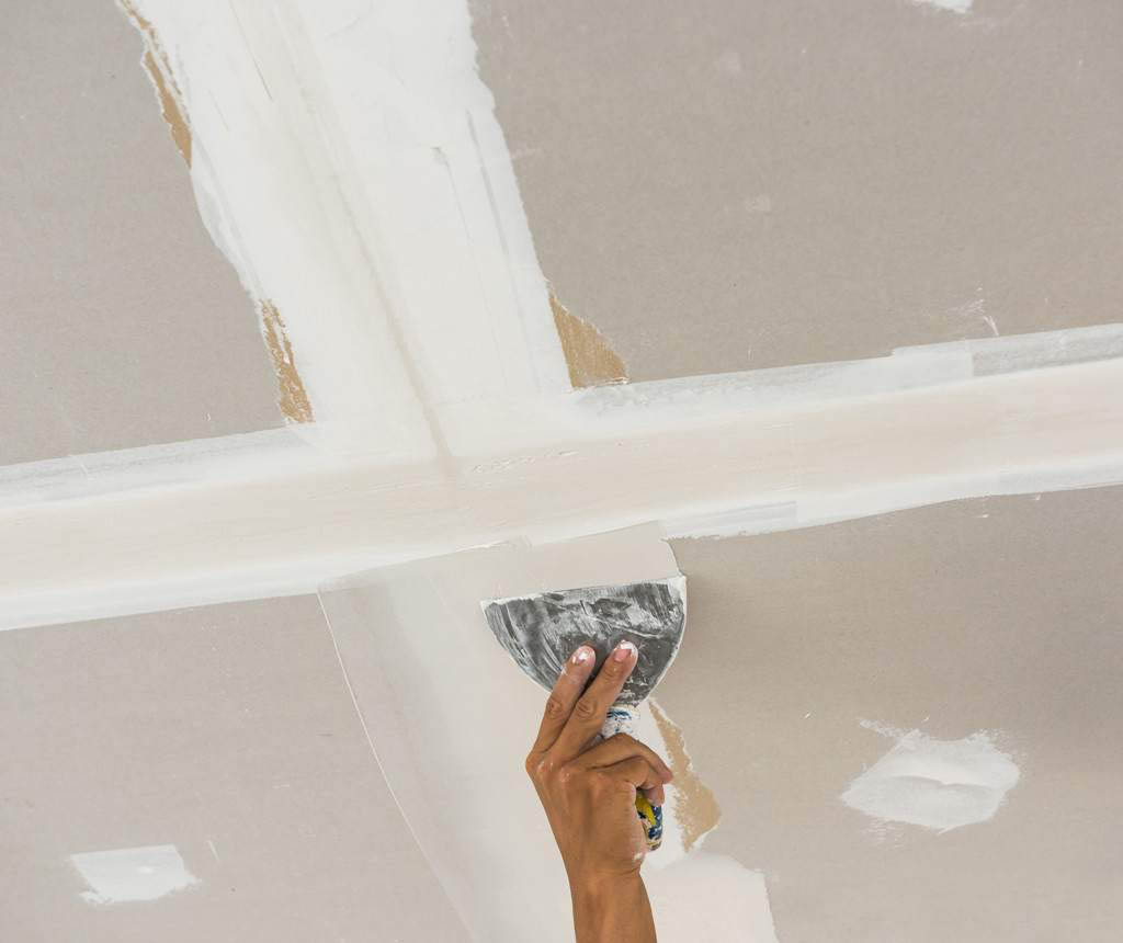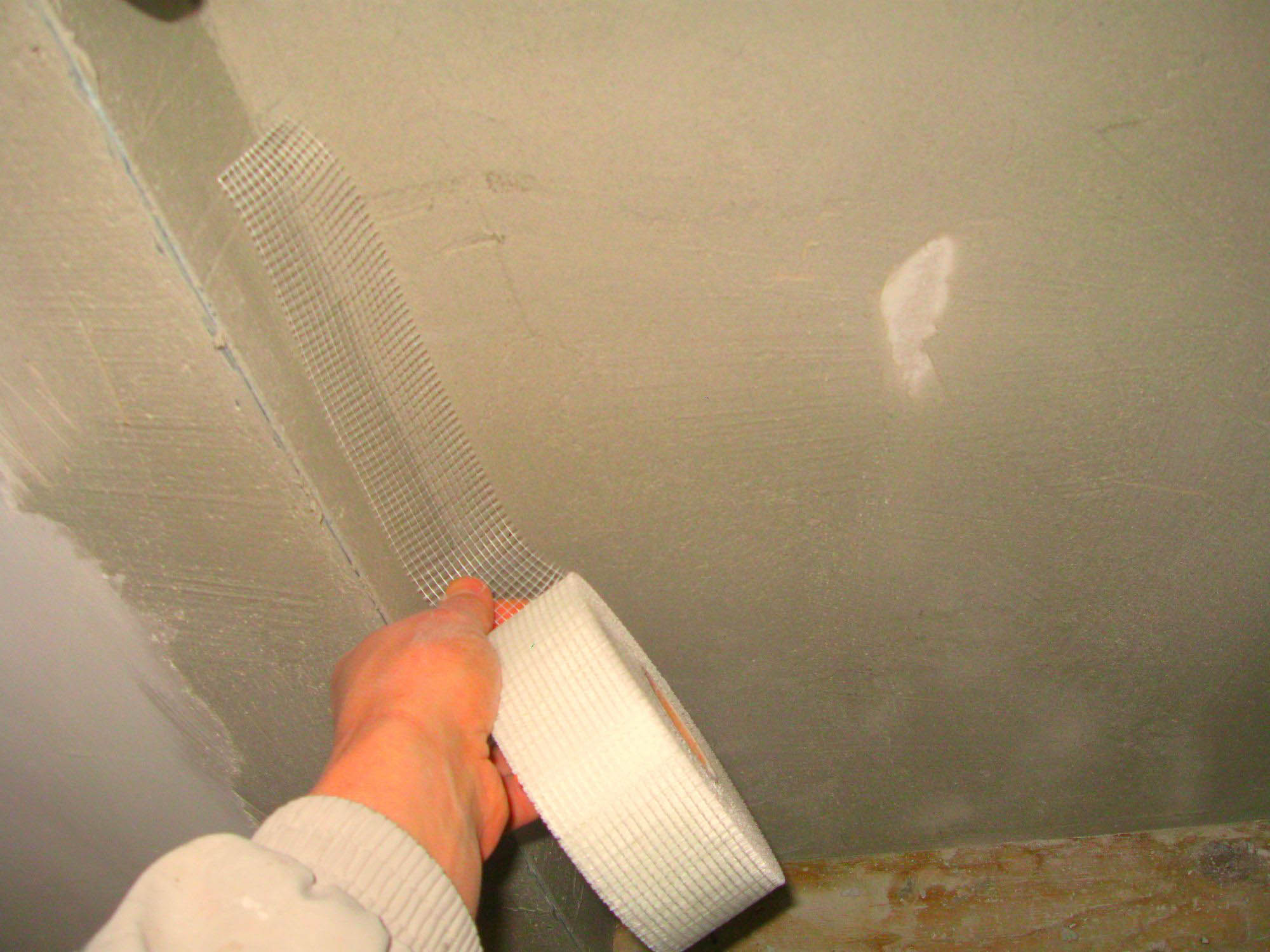 Стыки листов заклеиваются армирующей лентой, «серпянкой». Сквозь нее в швы втирается гипсовая шпатлевка. На этом этапе необходимо зашпаклевывать также все повреждения листа и головки саморезов.