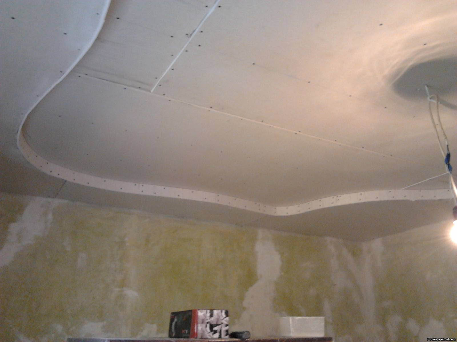 - Первый – монтаж листов ГКЛ по всей плоскости потолка, с последующим наращиванием выступающих вниз частей конструкции.