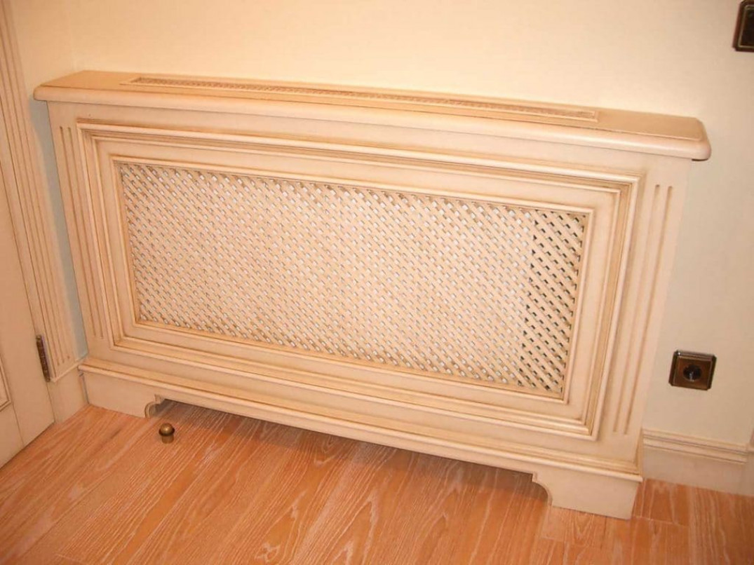 Открытая батарея сразу бросается в глаза и в квартире ее стремятся чем-то декорировать. Для этого приходят на помощь деревянные деревянные решетки, закрывающие старые чугунные батареи, они выполняются из натуральных пород деревьев бука и дуба. Такие экраны долговечны и надежны. Они могут быть: крашенными и нет, покрытыми эмалью или тонированы. Чтобы решетки не препятствовали прохождению тепла, их монтируют не на пол, а поднимают на некоторое расстояние над полом. Для лучшей циркуляции воздуха вверху на коробе делают отверстия.