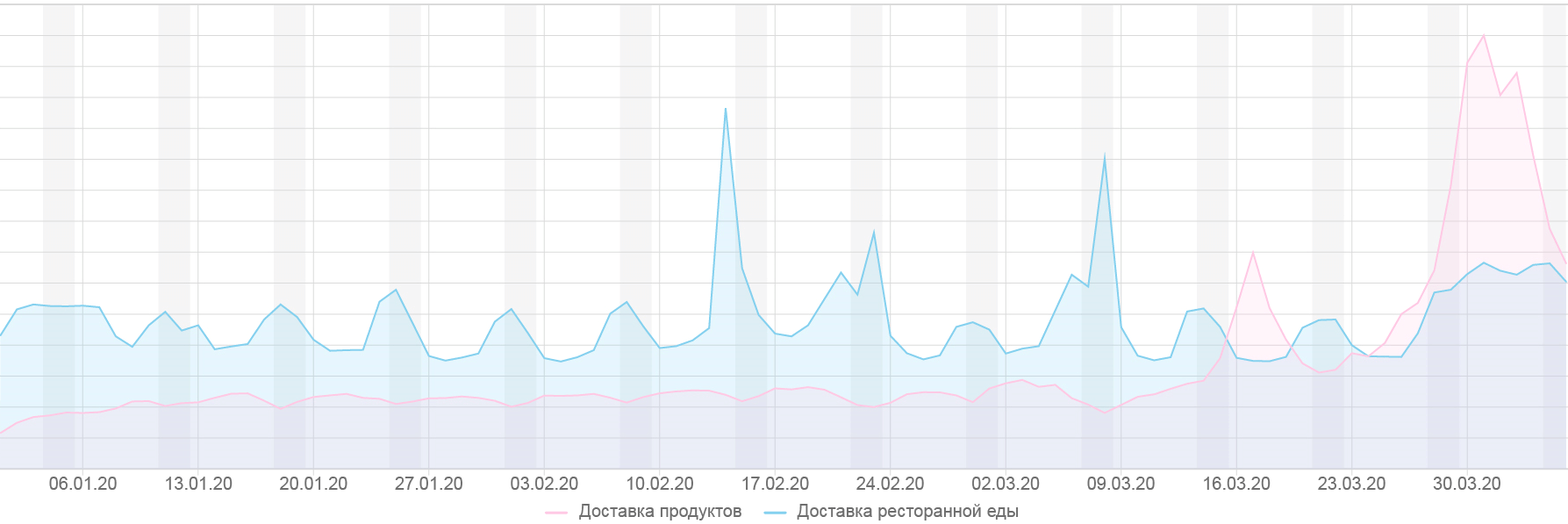 По данным «Яндекс.Взгляда», интерес к доставке продуктов находился на пике в конце марта и начале апреля, в шесть раз превысив средние показатели февраля 2020 года